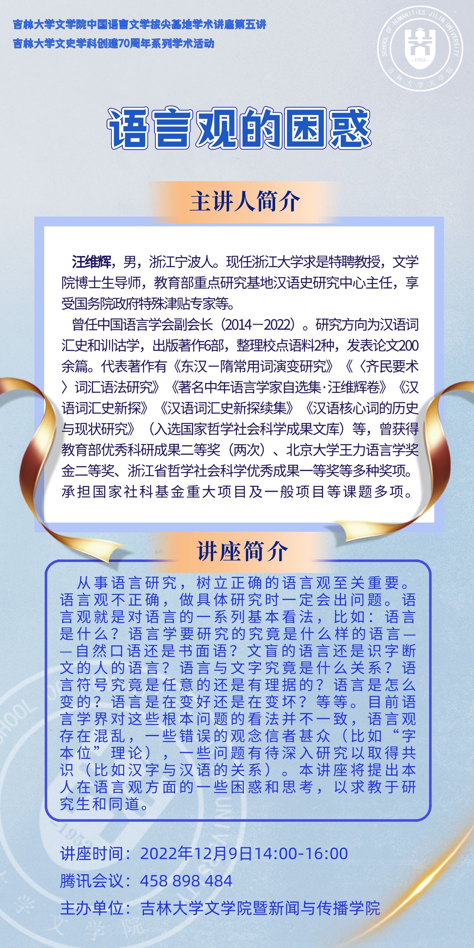 内容简介:从事语言研究,树立正确的语言观至关重要。语言观不正确,做具体研究时一定会出问题。语言观就是对语言的一系列基本看法,比如:语言是什么?语言学要研究的究竟是什么样的语言——自然口语还是书面语?文盲的语言还是识字断文的人的语言?语言与文字究竟是什么关系?语言符号究竟是任意的还是有理据的?语言是怎么变的?语言是在变好还是在变坏?等等。目前语言学界对这些根本问题的看法并不一致,语言观存在混乱,一些错误的观念信者甚众(比如“字本位”理论),一些问题有待深入研究以取得共识(比如汉字与汉语的关系)。本讲座将提出本人在语言观方面的一些困惑和思考,以求教于研究生和同道。