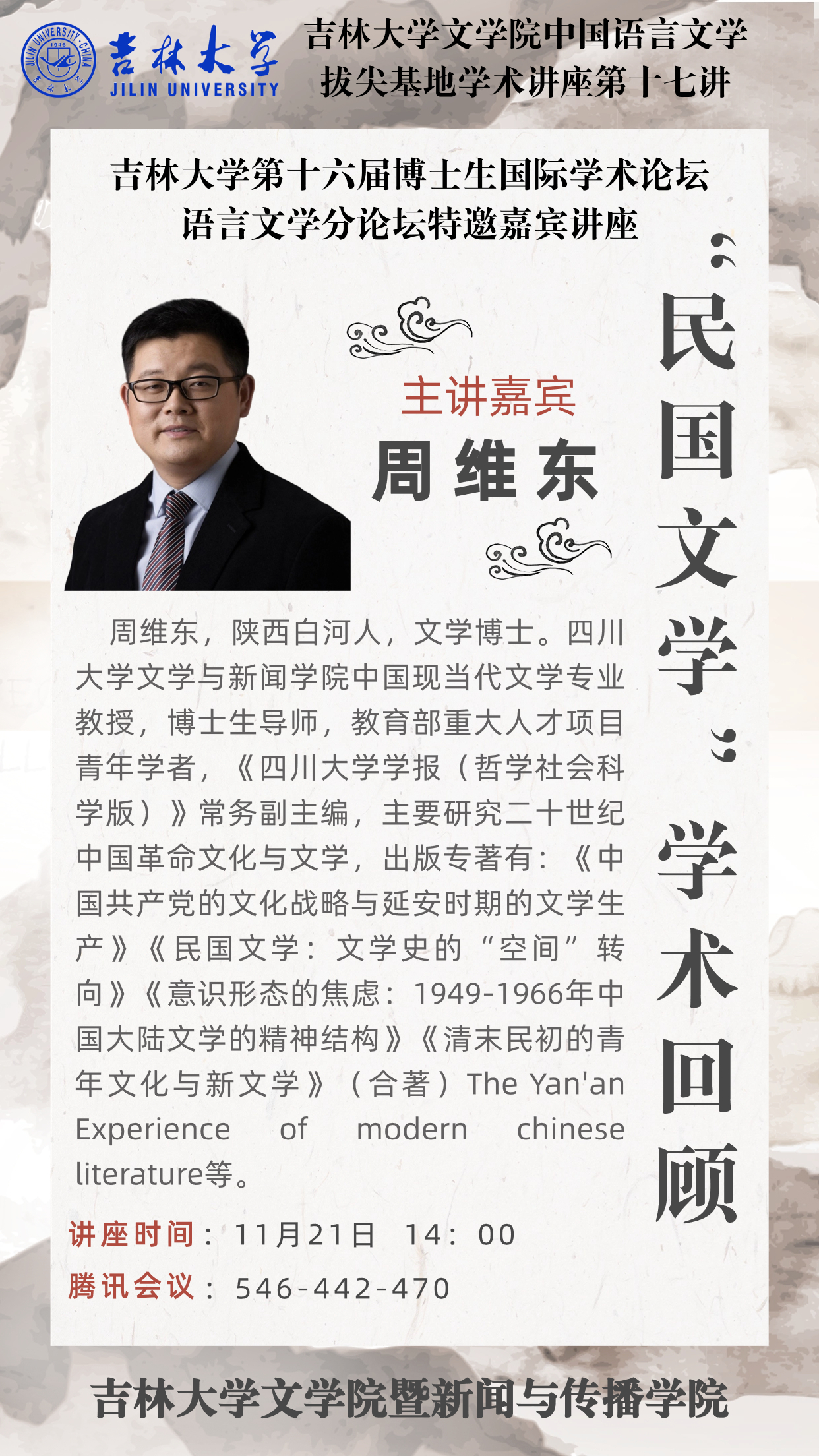 讲座人简介:周维东,陕西白河人,文学博士。四川大学文学与新闻学院中国现当代文学专业教授,博士生导师,教育部重大人才项目青年学者,《四川大学学报(哲学社会科学版)》常务副主编,主要研究二十世纪中国革命文化与文学,出版专著有:《中国共产党的文化战略与延安时期的文学生产》《民国文学:文学史的“空间”转向》《意识形态的焦虑:1949-1966年中国大陆文学的精神结构》《清末民初的青年文化与新文学》(合著)The Yan'an Experience of modern chinese literature等。
