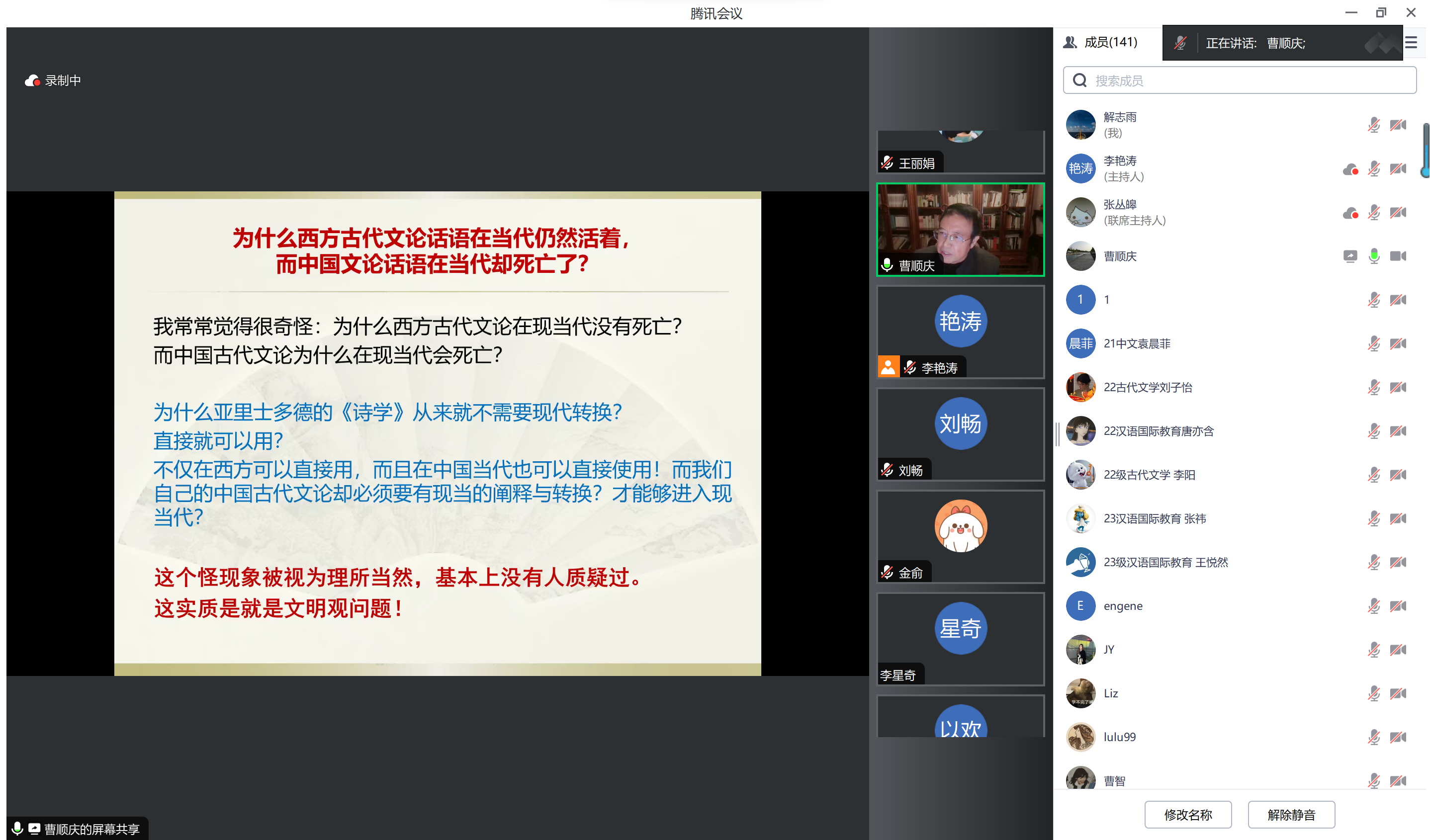 2023年11月20日晚,四川大学杰出教授(院士待遇)、文学与新闻学院学术院长,欧洲科学与艺术院院士,国批博士生导师(1993),教育部重大人才项目特聘教授,比较文学学会第四任会长,国家社科基金评委曹顺庆教授在腾讯会议为成人在线