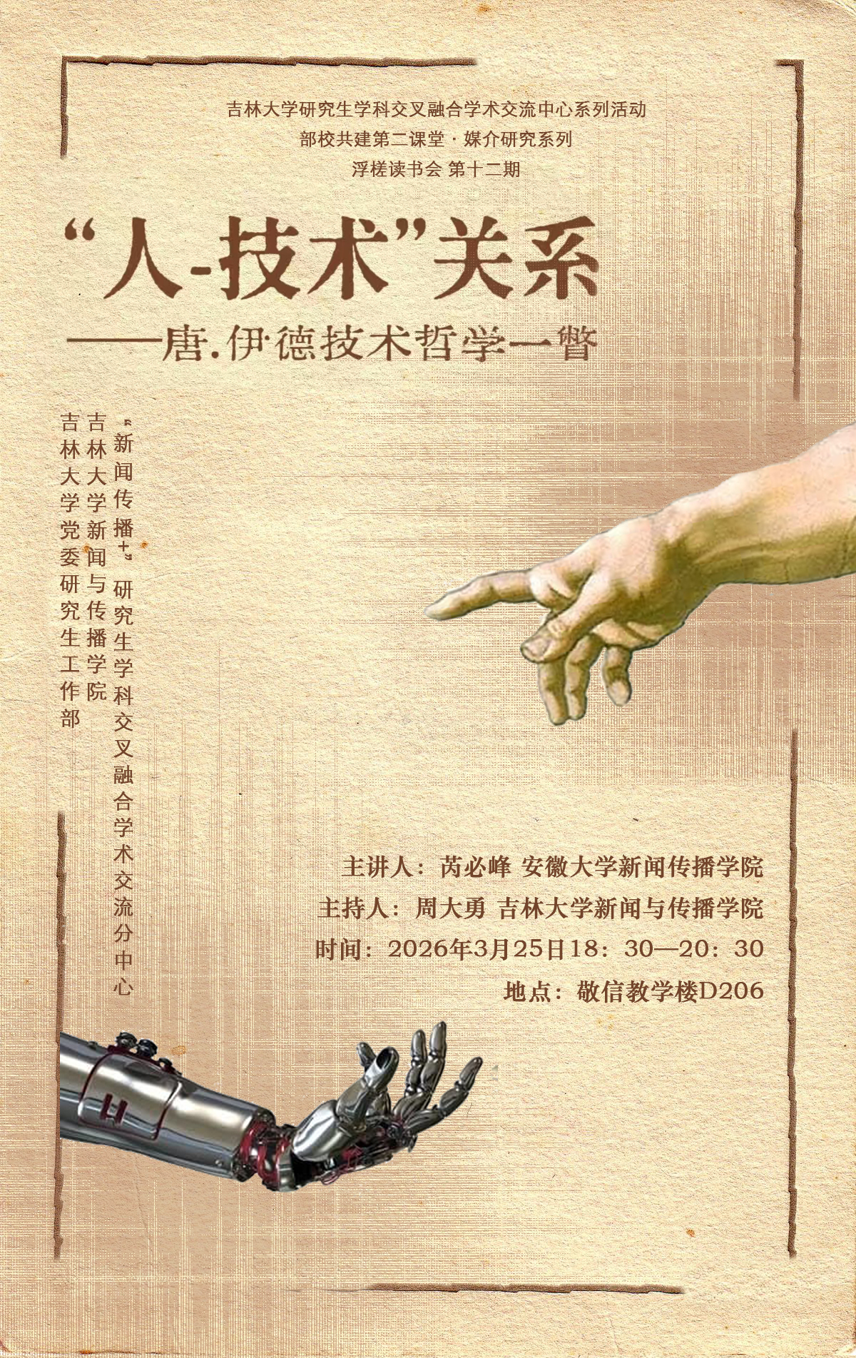 为活跃学术氛围,提升学科专业素养,拓宽学科交叉融合研究视野,加深对人与技术关系的理解,并强化学生运用理论视角观察、分析、阐释传播现象与文化现象的能力,特邀请安徽大学新闻传播学院芮必峰教授做“‘人-技术’关系——唐.伊德技术哲学一瞥”学术讲座。具体通知内容如下: