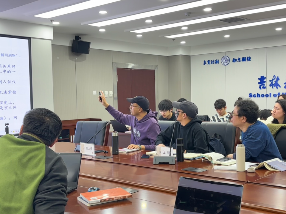 同学们也就自己对书中相关问题的不同理解积极展开讨论。24级研究生于蕙宁对王博学副教授的观点表示赞同,认为伊恩·霍德对人与物的观点与人本主义地理学家段义孚的在《制造宠物》中对人与物的观点是有所共通的,涉及到人对物的支配,将人使用物视作是一种驯服;24级博士生徐拂洋将人与物的关系与技术哲学的“物的转向”相结合,提出自己的看法;22级本科生黄贤则做出了一个有趣的假设:倘若有一个主权者高悬其上,可以监管人们对于物的欲望,那人与物的纠缠是否能减少或变得可控?22级博士生王少群则基于师生对该假设的讨论提出了进一步问题:老子的无为和薛定谔说“生命以负熵为生”是否有共通之处?24级研究生魏进兰着眼依赖、依附二者词意区别,从两方面的角度对人-物关系做出了辨析。