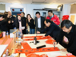 十楼四周挂着红色的灯笼,抬头向上望去,来自十一楼的气球传递着欢乐,伴随着灵动的音乐,迎新年茶话会从有趣的猜谜开始。大厅周围一条条彩色纸带上写着谜语,书法字体优美,而解谜更吸引着教职工的好奇心。
