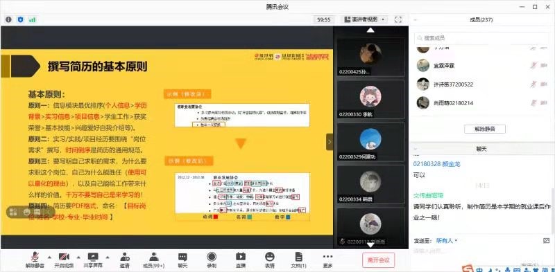 最后,吴老师解答了关于“简历”的一些问题并讲述了简历的设计与撰写简历的基本原则,强调要注意信息模块的最优排序,有关经历要围绕“岗位需求”撰写,写明求职需求等。一个小时的讲座在老师与同学们的热烈互动中结束。