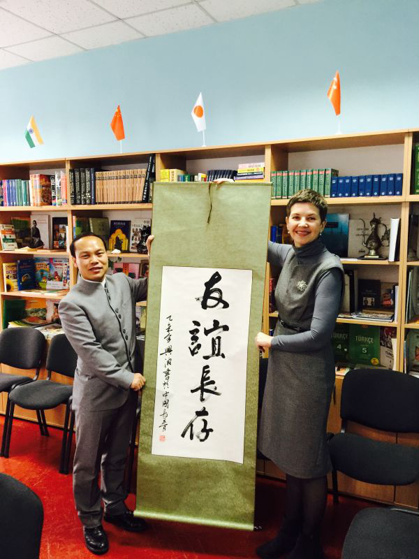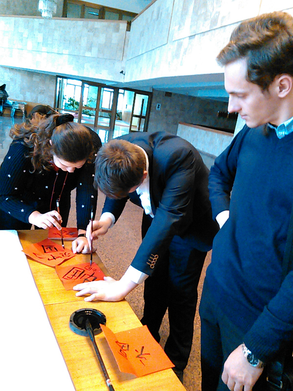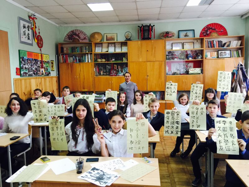 由兴波老师应邀到基辅市第一东方语言学校进行文化推广活动。该校是乌克兰最大的汉语教学机构,全校学生1200余人,共开设包括汉语在内的8个语种,其中学习汉语的学生就超过800人。由兴波老师会见了第一东方语言学校的校长阿克桑娜·科卢克留科女士,就相关学术合作事宜进行了探讨。由兴波老师向该校赠送了书法作品,并为该校的四个年级同学上了四节书法课,让乌克兰的孩子们感受到了原汁原味的中国文化。基辅第一东方语言学校将这一天称作“学校的重大节日”。