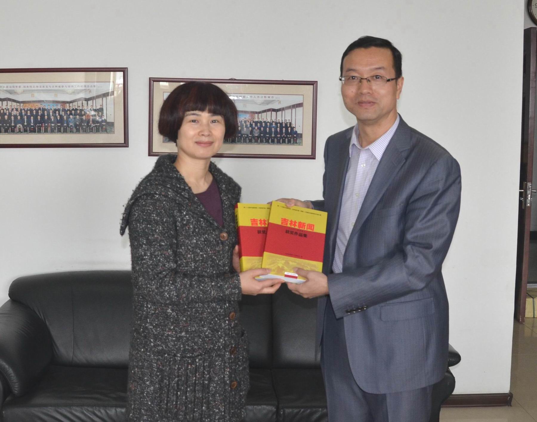 新闻与传播学院赠送了42册《吉林新闻获奖作品集(2015年卷)》。《吉林新闻获奖作品集(2015年卷)》是由吉林省新闻工作者协会策划、组织和编辑,是吉林省第一次把年度获奖新闻作品汇编成册,该书集中收录了吉林省新闻界2014年优秀新闻作品,其中全文收录第二十五届(2015年)中国新闻奖吉林省获奖作品3件、吉林新闻奖一等奖作品111件,另将吉林新闻奖二、三等奖获奖作品篇目列表收录,这些作品代表了全省新闻工作者的突出业绩成果,记录了吉林省改革开放和经济社会的发展脚步,也是新闻教学与研究的优秀素材。图为吉林省新闻工作者协会秘书长胡莺(左)向成人在线