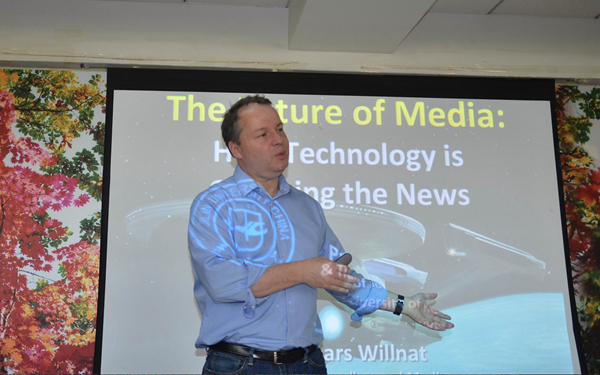 师生作了题为《媒体未来:技术如何改变着新闻》的讲座。讲座主要集中探讨了新技术如何影响娱乐媒体,以及新闻生产与消费。威尔耐特教授的报告主要包括三个部分。首先,基于当前美国的研究样本,他探讨了传统大众传媒的商业模式如何被因特网所破坏,以及这些“旧”媒介如何努力去适应“新”网络环境。随后,威尔耐特教授与在场的师生一同审视了在过去的几年里媒体消费如何变化,以及这些变化在美国如何影响传统媒体与网络媒体。最后,威尔耐特教授详细讨论了新的媒体技术,如无人机、社交媒体的应用技术、虚拟现实报道技术等如何影响现代新闻实践。
