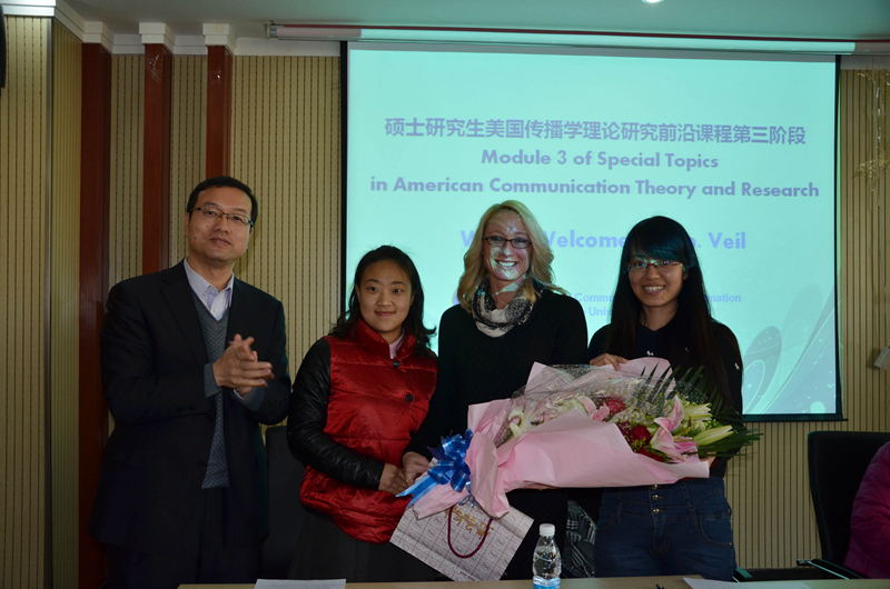 会议室充满着爱意与祝福,在2013级研究生于瑶同学的主持下,姚孟乐同学发表了热情洋溢的英文演讲,热烈欢迎放弃感恩节休假前来为我校新闻与传播学院研究生上课的美国肯塔基大学传播与信息学院副院长莎丽•R.维尔(Shari R. Veil)副教授,姚孟乐在感谢的同时,祝愿莎丽•R.维尔副教授在成人在线