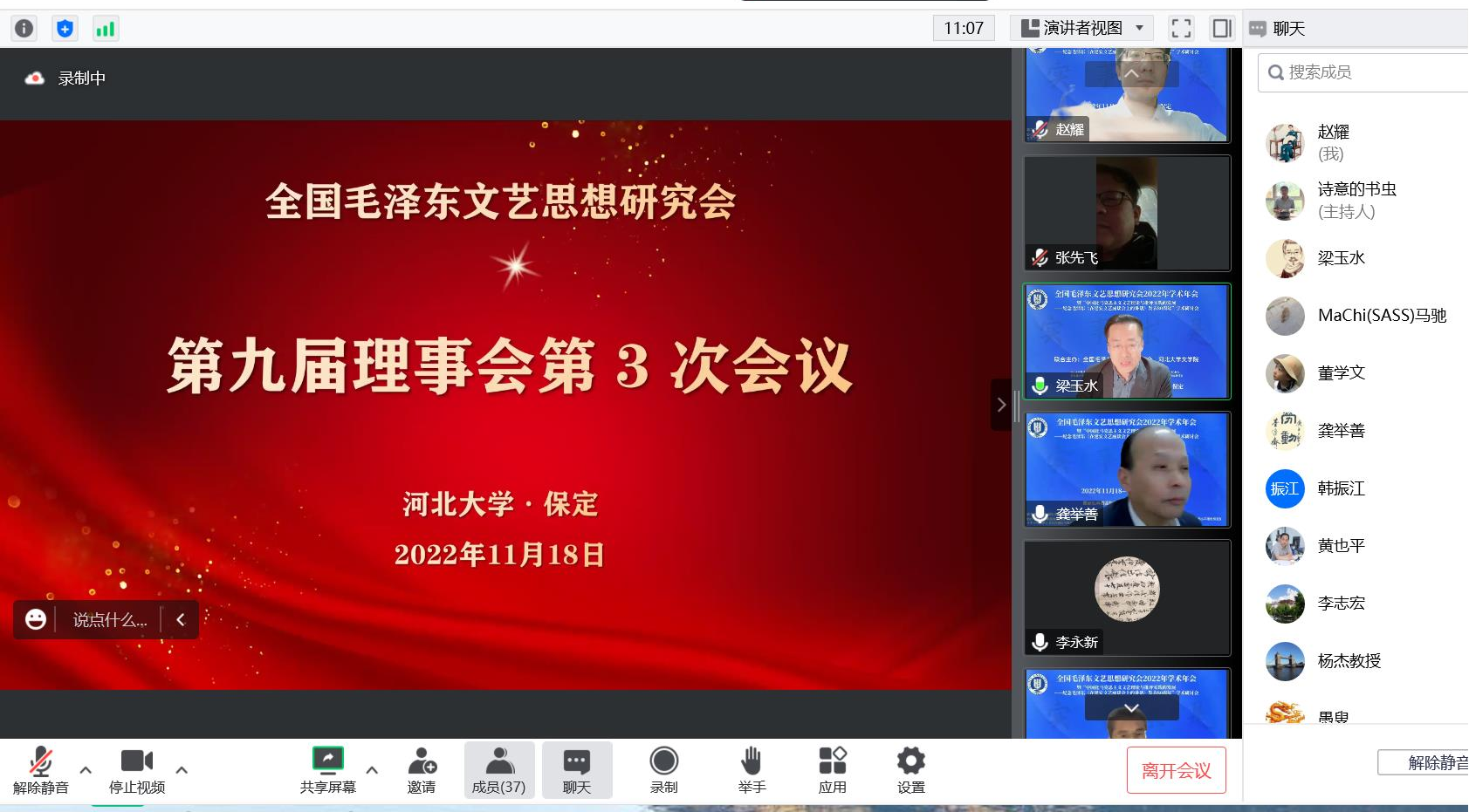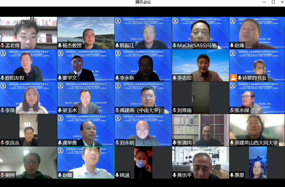 2022年11月19日—20日,全国毛泽东文艺思想研究会2022年学术年会暨“中国化马克思主义文艺理论与批评实践的发展——学习党的二十大精神、纪念毛泽东《在延安文艺座谈会上的讲话》发表80周年”学术研讨会胜利召开,会议采取了线上线下相结合的形式举行,成人在线