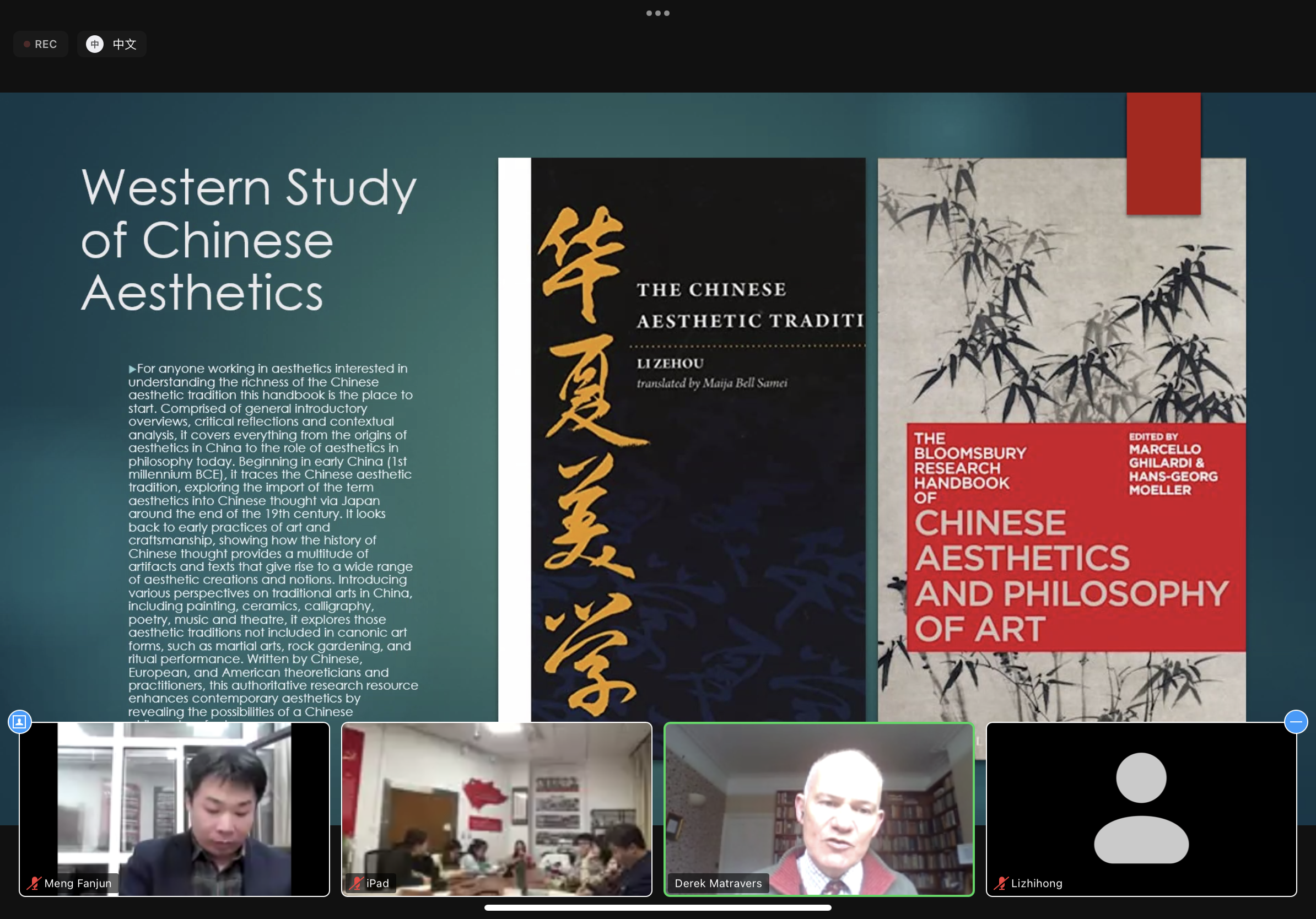 Derek Matervers教授首先从西方哲学“分析哲学”和“大陆哲学”的两个传统引入,回顾了分析美学的近代发展。纵向上,他从分析美学诞生的奠基人G. E. 摩尔到五六十年代战后时期所产生的分化进行了梳理;横向上,从审美判断和批评哲学这两个层面进行了归纳出分析美学的核心议题。其次,Derek Matervers教授按照主题归纳出《英国美学杂志》近年来的发稿的类型,这些为老师和同学们以后的写作或了解分析美学的研究动态非常有帮助。接下来,Derek Matervers教授分享了美学近景中的热点问题:环境美学、文化美学、政治美学和比较美学。最后,Derek Matervers教授为老师和同学们提出了非常重要的论文写作建议,对于中西比较美学方向,以及师生们的日常写作具有重要的借鉴意义。最后,Derek Matervers教授表达了对未来美学发展的光明前景的确信,并期待着日后与成人在线