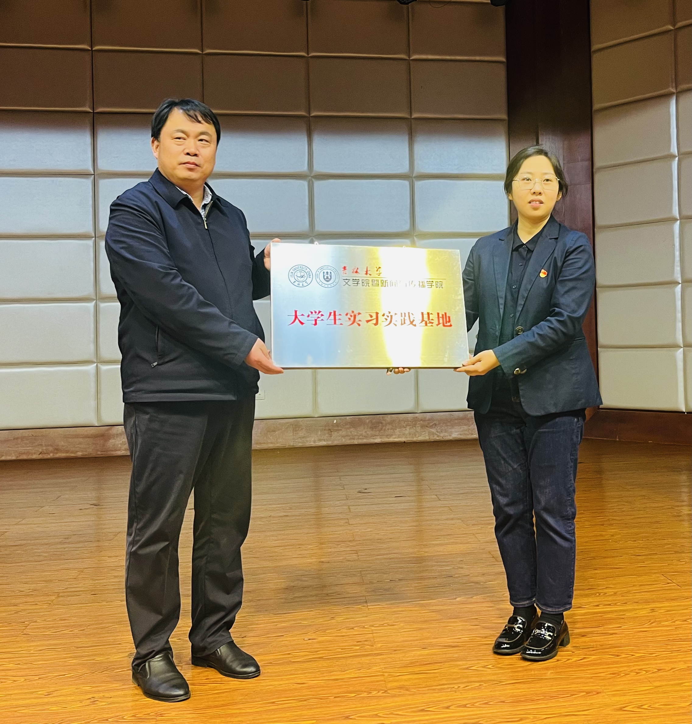 暨新闻与传播学院实习实践基地牌匾;马卫东副院长向鹿邑县高级中学授予了成人在线