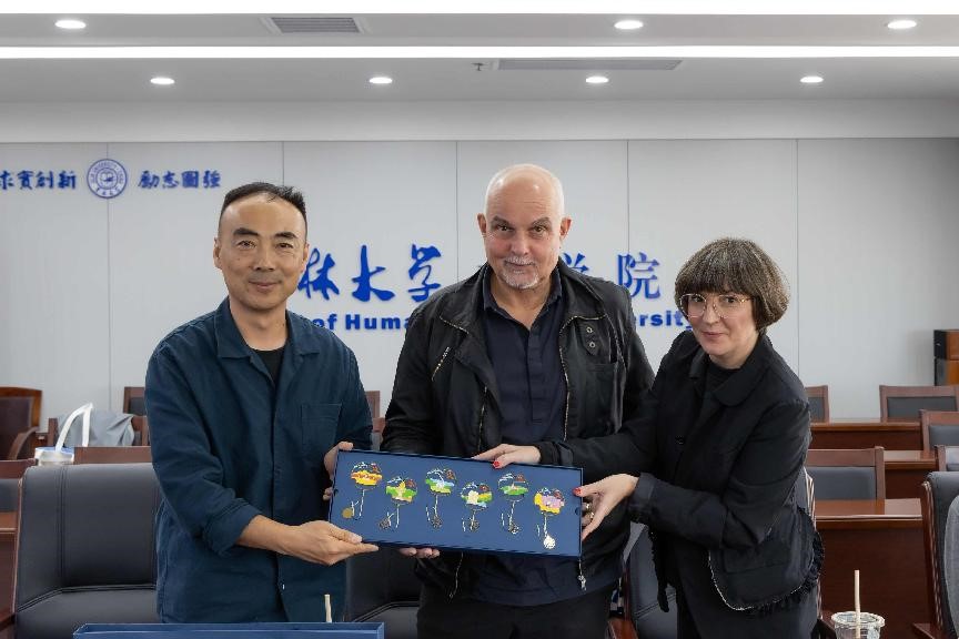 在座谈的最后,Markus Weisbeck教授向广告学专业赠送了个人教学案例丛书,书中详细介绍了他在教学过程中的经历、创意以及独特的教学方式方法。鞠惠冰教授也将吉大文创产品作为礼物回赠给Markus Weisbeck教授。