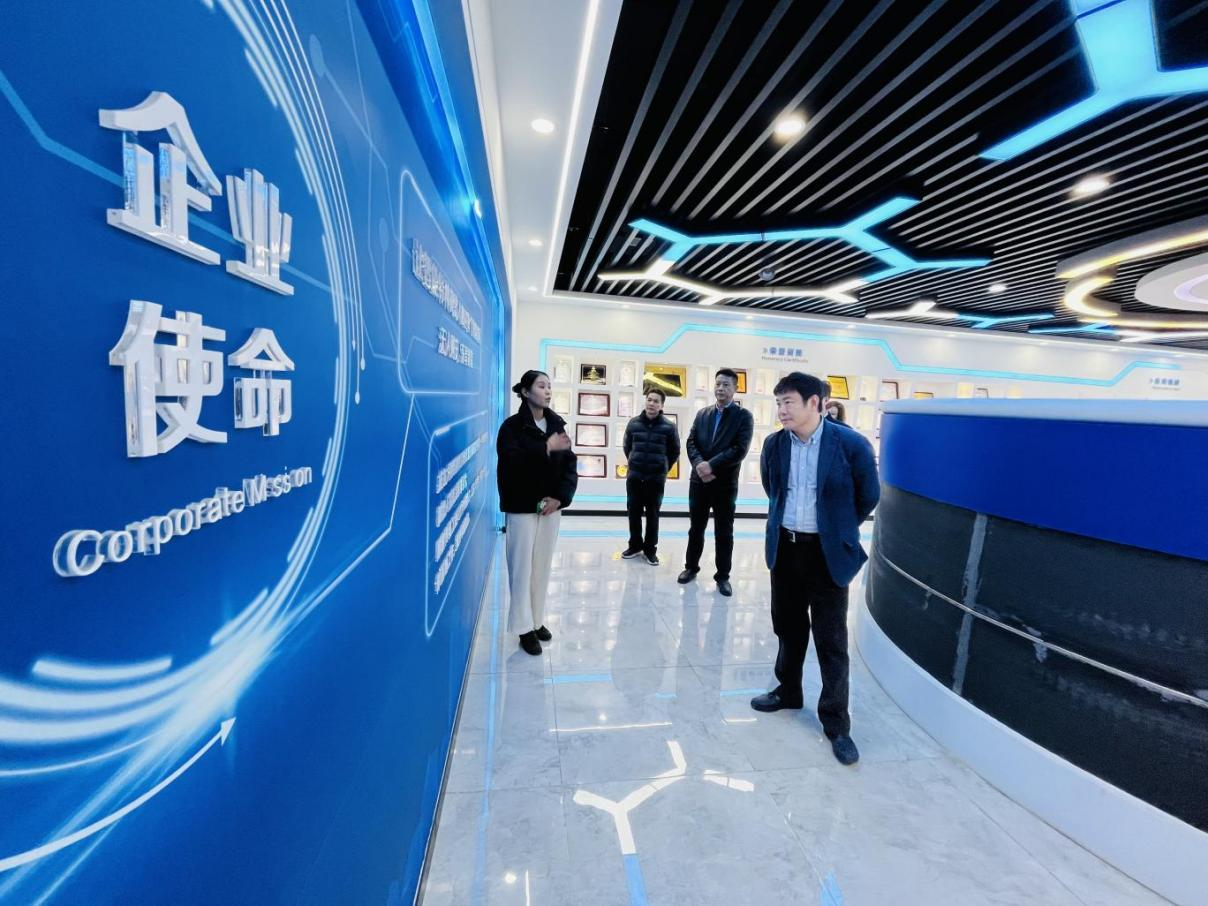 张丛皞一行在博清公司副总经理王道平等人的陪同下,认真参观了博清公司的党建展厅,听取了公司党建情况、公司价值观、使命愿景、成人在线、团队建设、公司产品等情况的介绍。