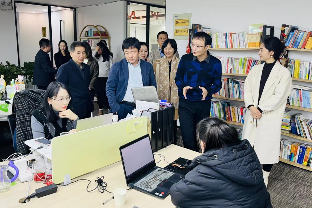 在安徽洞见科技有限公司,张丛皞院长一行与丁来峰董事长围绕校媒融合、实习实践基地合作共建、人才培养、新媒体传播等方面,进行了深入细致交流。
