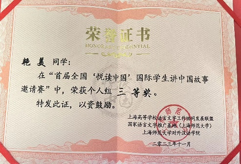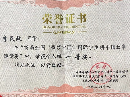 本次比赛面向全国高校发出邀请,经过初赛阶段的线上评审和选拔,最终来自31个国家、45所高校的102名国际学生参加了线下复赛和决赛。经过激烈角逐,我校国际语言学院本科三年级的李民政(韩国)以其优秀的汉语表达能力和对中国文化的深刻理解、精彩讲述脱颖而出,荣获一等奖。我校另一位入围复赛的学生艳美(泰国),以其活泼灵动的表现力感染了在场的每一个人,荣获三等奖。领队教师董美含,荣获优秀指导教师。