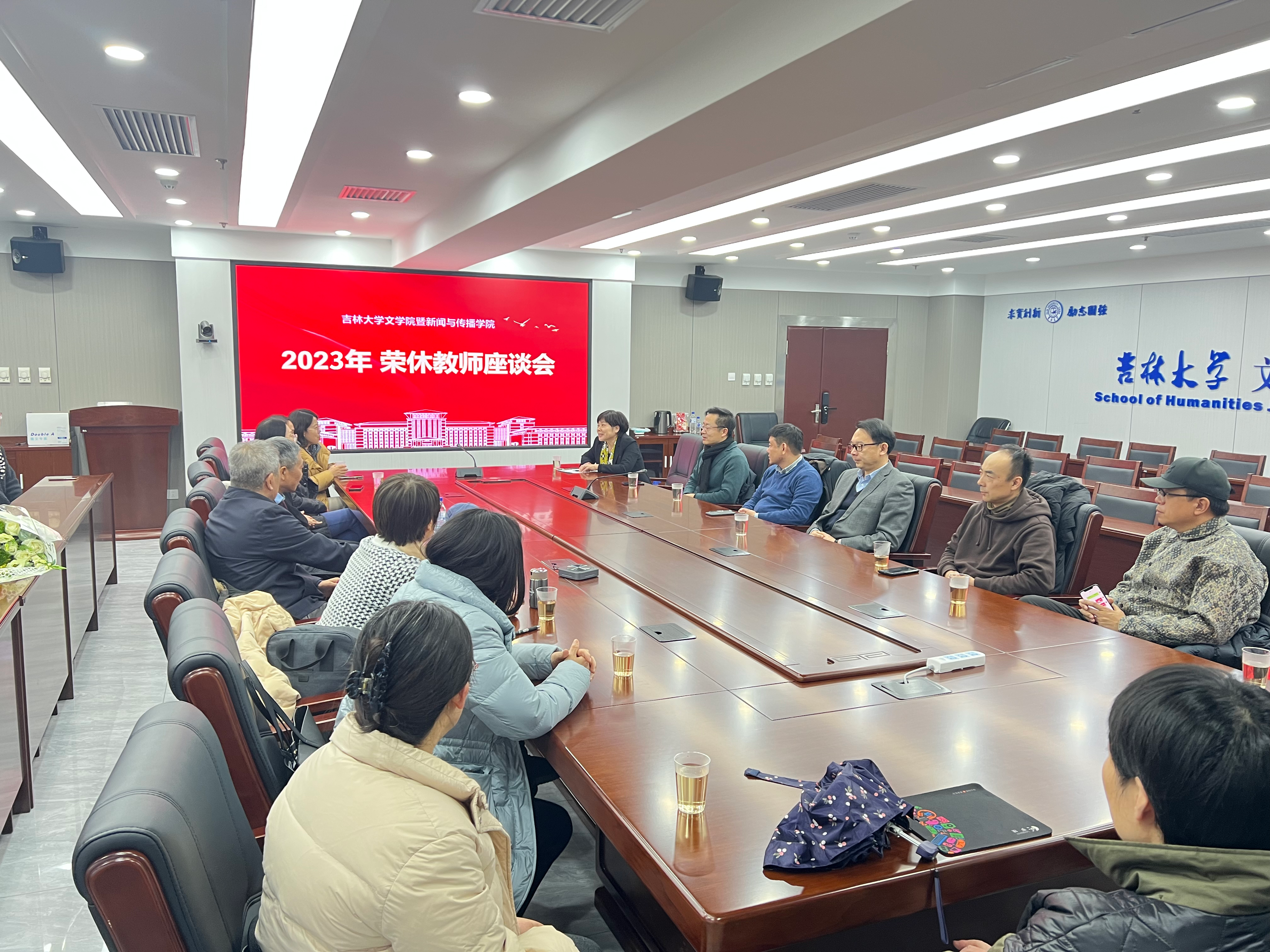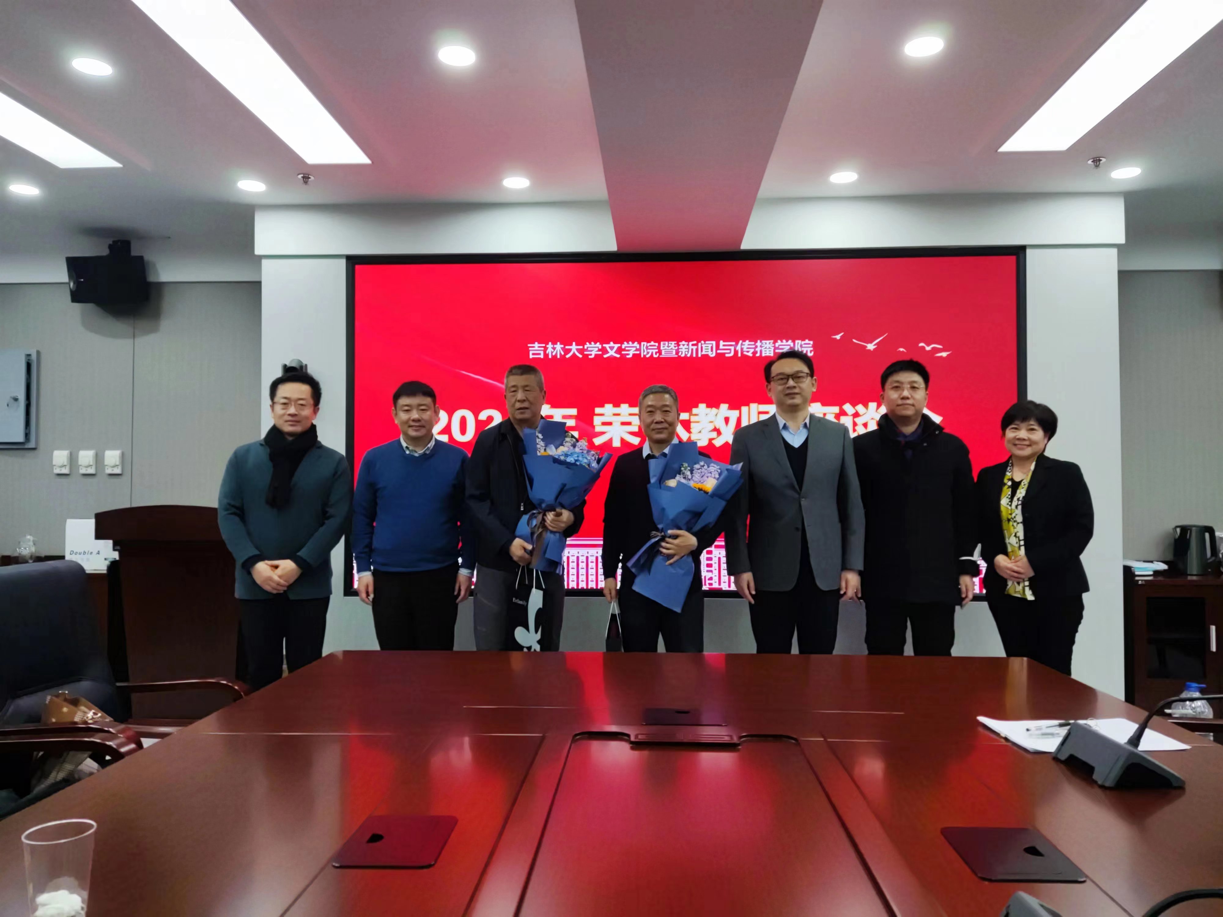 在东荣大厦1004室举办了荣休教师座谈会。荣休教师吕明臣教授、刘晔骁副教授,院长张丛皞、党委书记霍志刚、副院长刘艳、副院长梁玉水、副院长姜明、传播学系主任鞠惠冰、语言学教研室主任黄玉花和部分教师参加。座谈会由副院长刘艳主持。