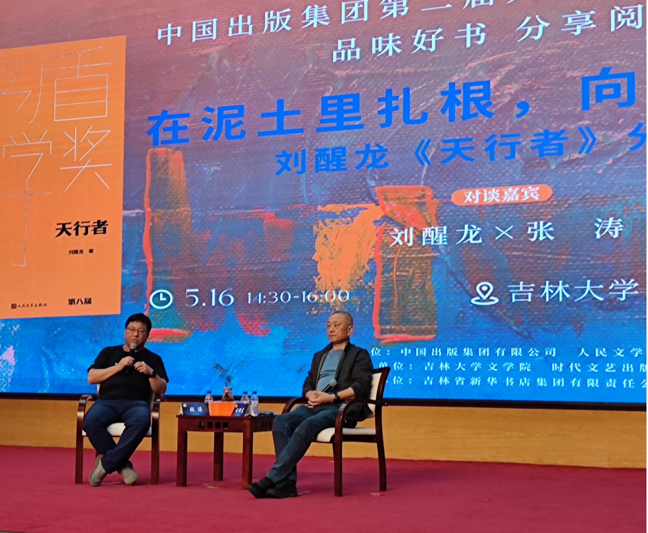 教授张涛与湖北省文联名誉主席刘醒龙围绕名作《天行者》进行对谈。刘醒龙动情地讲述了这部以民办教师为主人公的小说之写作缘起。他指出,广大民办教师为我们国家的发展做出了不可磨灭的巨大贡献,但那时候却处于弱势的社会地位和艰难的生活环境中。他强调,作家必须要有良知,要有责任感和担当。他还谈到他的考古与历史题材创作,介绍了想象力、敏感性、阅读文献和实地考察,如何在这类写作中起到重要作用。张涛对于刘醒龙小说的现实情怀与艺术成就进行了阐释。两人还就文学中的温情与犀利进行了讨论。刘醒龙在回答现场学生关于AI挑战的提问时说:AI是平庸写作的天敌,而我们要追求的是艺术的高峰。本届文学周中的“作家进校园”活动作为中国出版集团第二届大学生阅读分享活动的一个环节,由中国出版集团有限公司人民文学出版社主办,成人在线