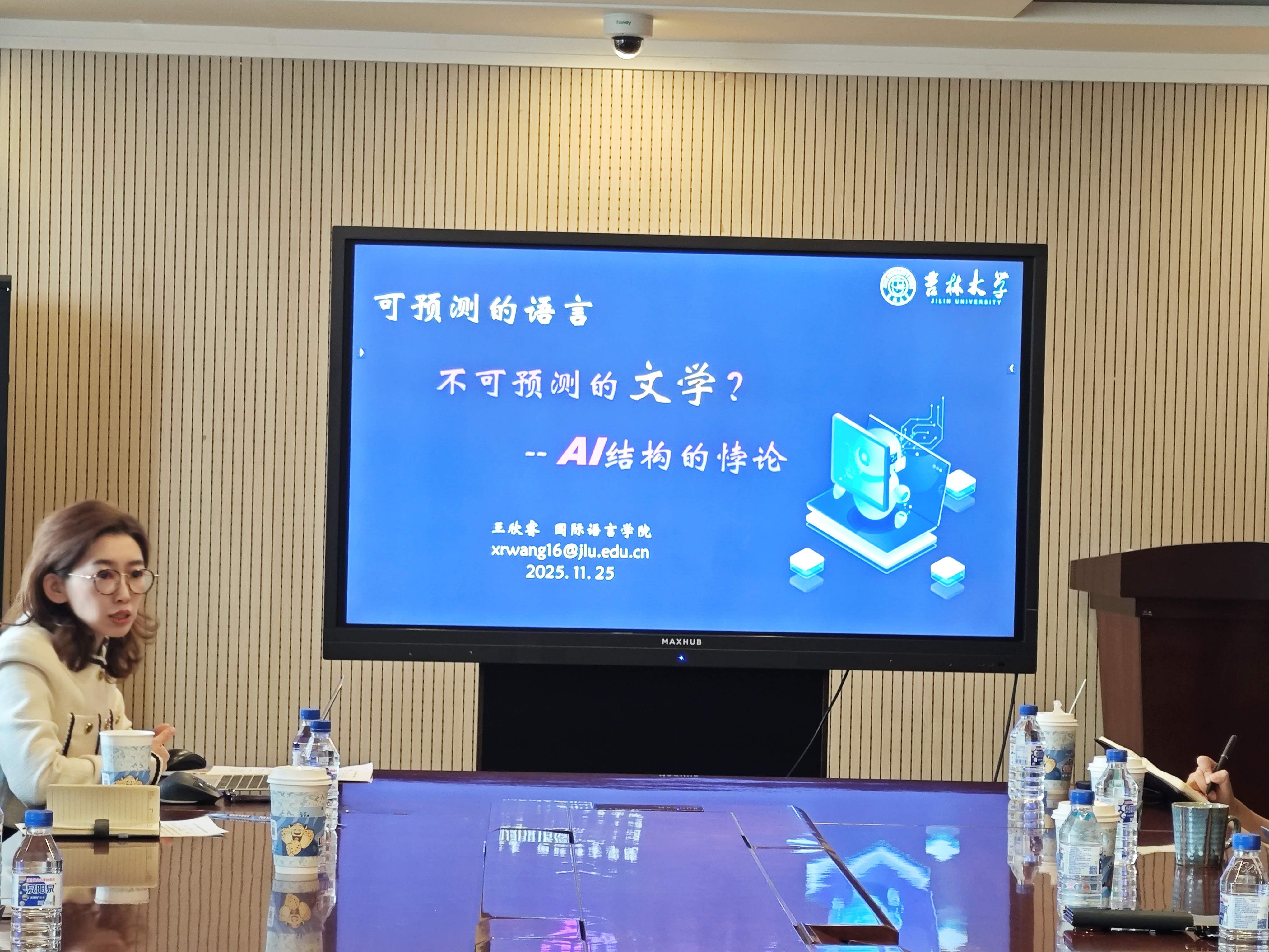 吉林⼤学“励新优秀⻘年教师”培养计划⼊选者,国际语言学院王欣睿副教授作了题为“可预测的语言,不可预测的文学?——AI结构的悖论”的学术报告。王欣睿副教授长期从事国际中文教育与现当代文学交叉研究。本次报告聚焦 AI 技术对文学创作的深层影响,展现了跨学科研究特色。