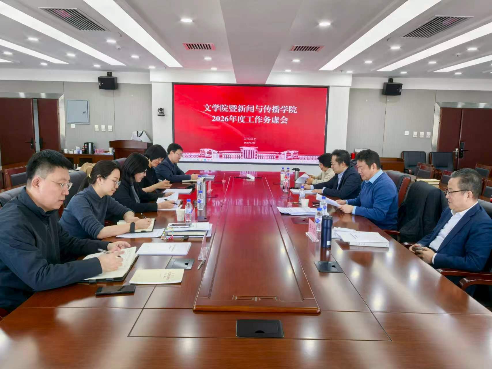 暨新闻与传播学2026年度工作务虚会在东荣大厦十楼会议室召开。学院领导班子成员、党委办公室主任、学院办公室主任参加本次会议。会议由院长张丛皞主持。