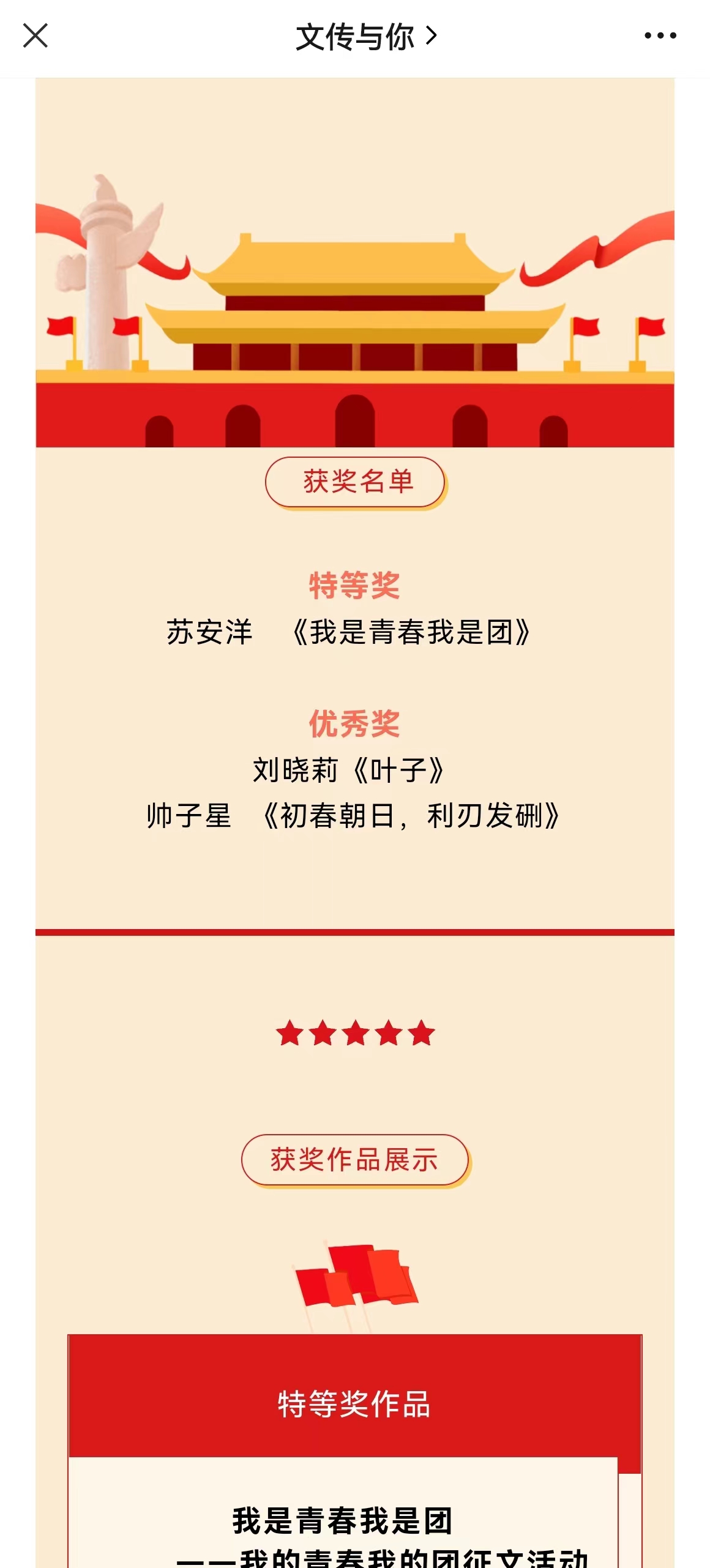 公众号等渠道了解活动、积极投稿,经学院评定,最终来自新闻与传播学类2021级团支部的石如玉获得特等奖,来自新闻与传播学类2020级团支部的焦若彤、刘颖琪、朱富鑫获得优秀奖,来自汉语言文学2021级团支部的王鹏茹获得优秀奖。本次活动加深了同学们对百年团史的学习了解,增强了广大学生的爱党爱团意识。