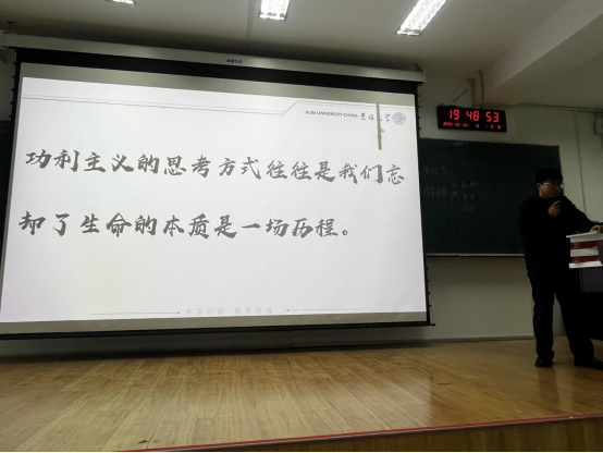 年级大会的最后,辅导员老师通过“功利主义的思考方式往往使我们忘却了生命的本质是一场历程”与诸君共勉,表达学院对莘莘学子的期待。大学,所谓大者,集古今之大成,博众家之所长;所谓学者,脚踏实地以求真,自强不息以求实。大学的本质意义不能是功利的物质享受,而应识大学之道,在明明德,专注自己,行稳致远,让沉稳压倒浮躁,厚重盖过浅薄,让精神的蕴能擦去脸上的肤浅和无知。