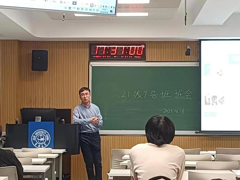 逸夫教学楼511教室,开展了新闻与传播学院广告班10月班会活动,陈新阳老师主持会议,广告班同学准时到场,会议有序展开。首先,陈新阳老师向同学们讲解了习近平总书记对宣传思想文化工作作出的相关指示,结合当前世界局势,引导同学们理性思考,结合自身讲好中国故事。其次,陈新阳老师就学业与未来发展方面与同学们进行了亲切友好的交流,鼓励同学们确立目标,积极收集相关信息,做好未来规划,结合自身实际情况,确立自己的未来发展方向。最后,陈老师讲解了学年论文的具体信息及注意事项,提醒同学们积极与导师交流,并且提前做好相关准备工作。