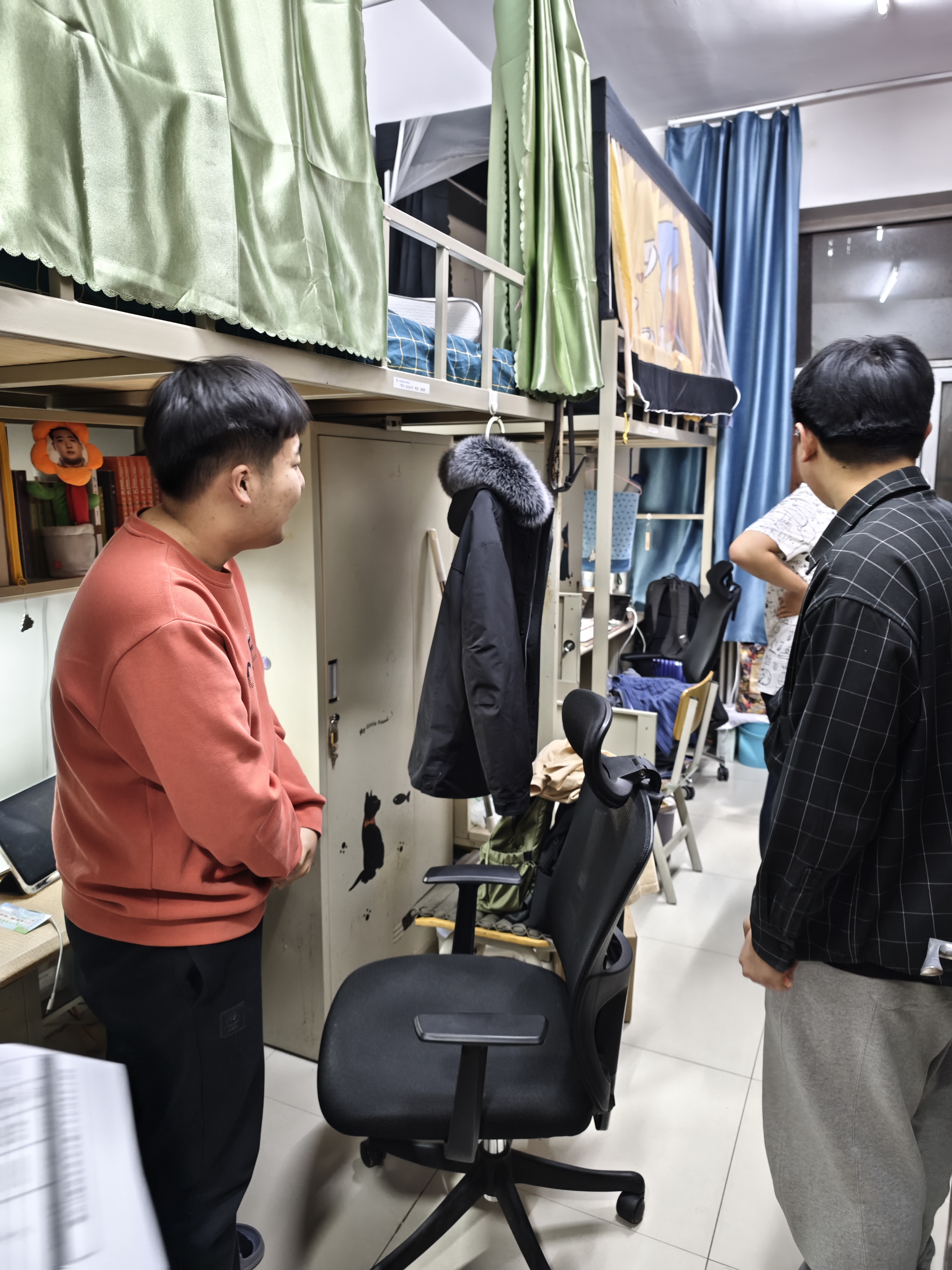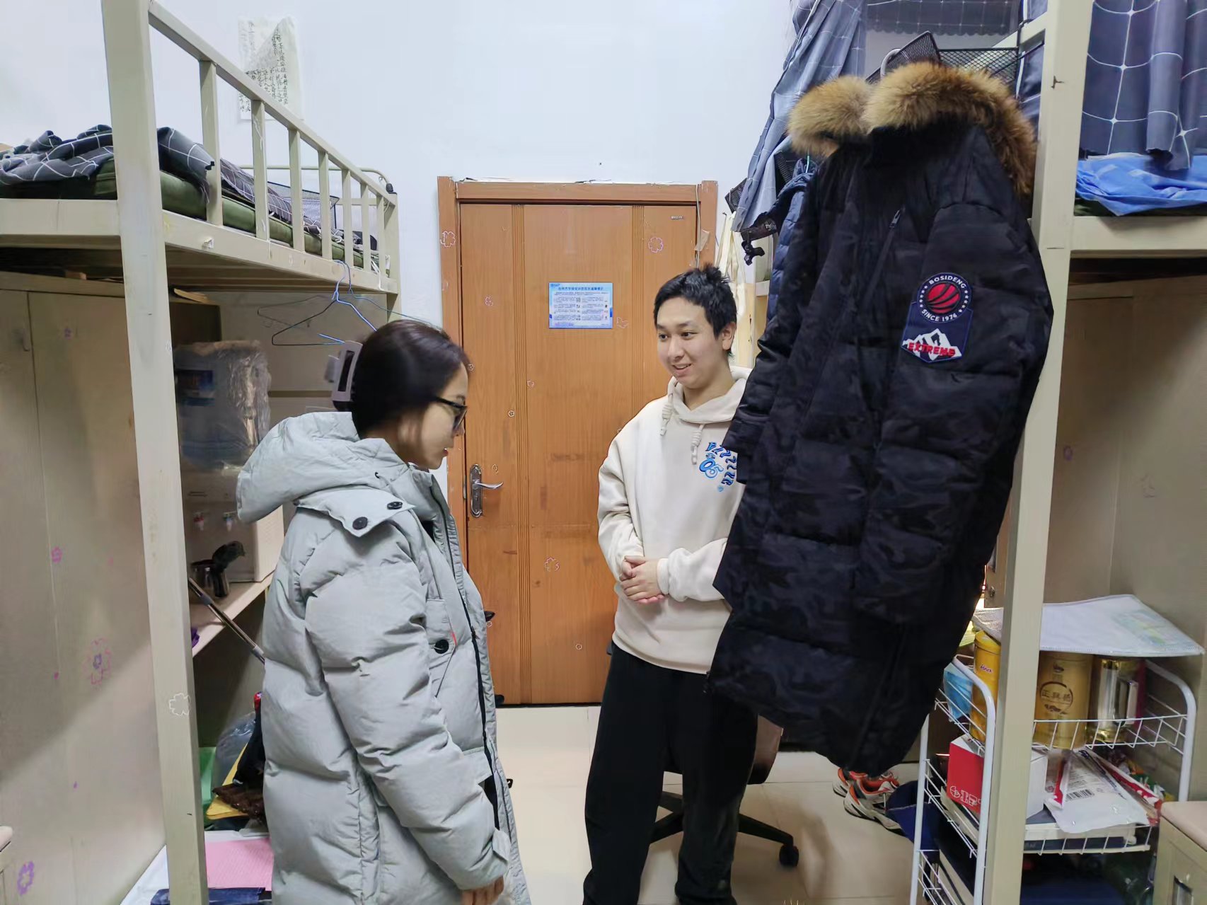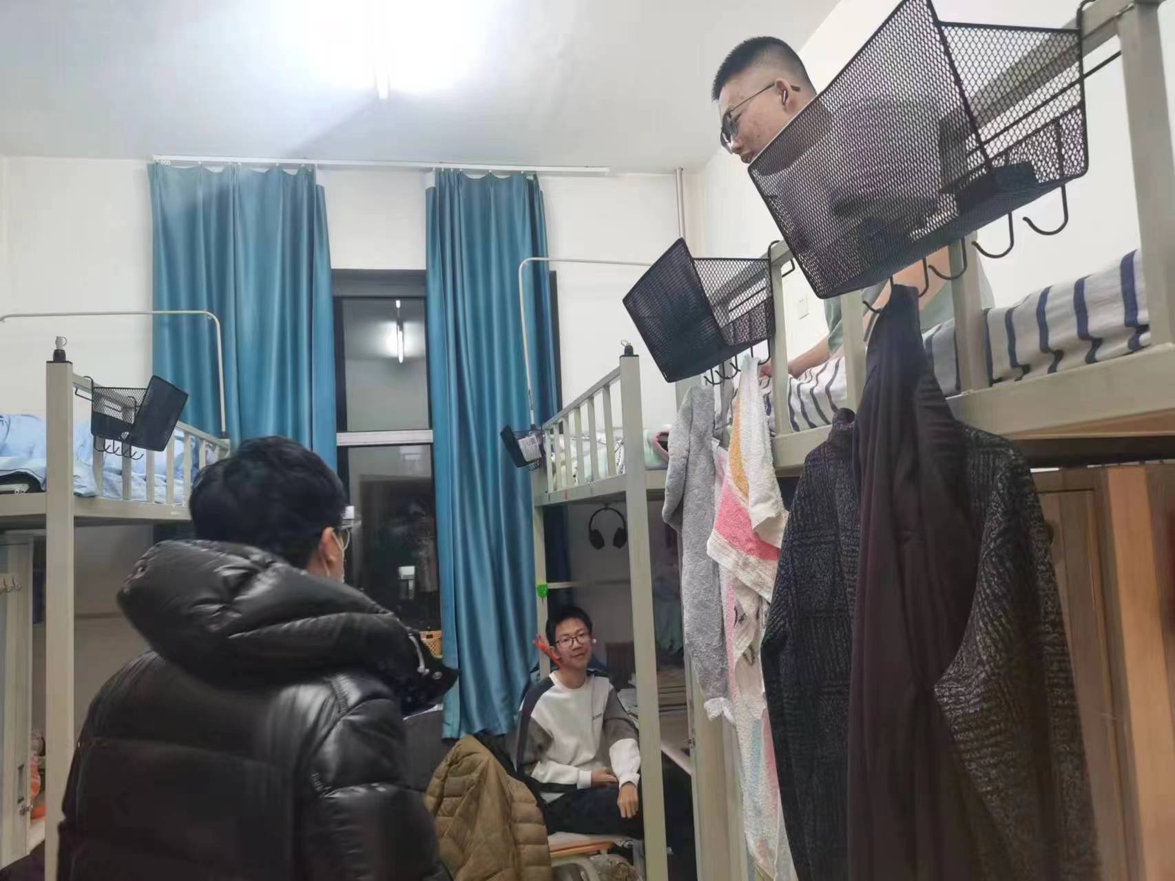 暨新闻与传播学院2020级兼职辅导员曲昭琦、2021级辅导员杨佳欣、2022级辅导员王振彰、2023级辅导员于航走进南苑二公寓和北苑二公寓,重点关注同学们的返校情况、返校后的身心状态、寝室卫生情况,寝室用电安全。