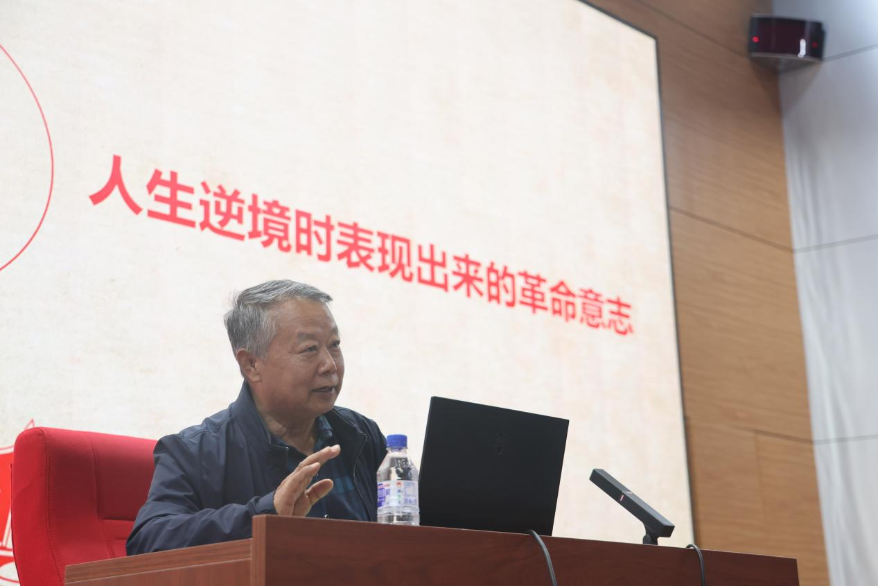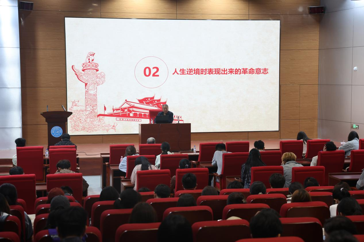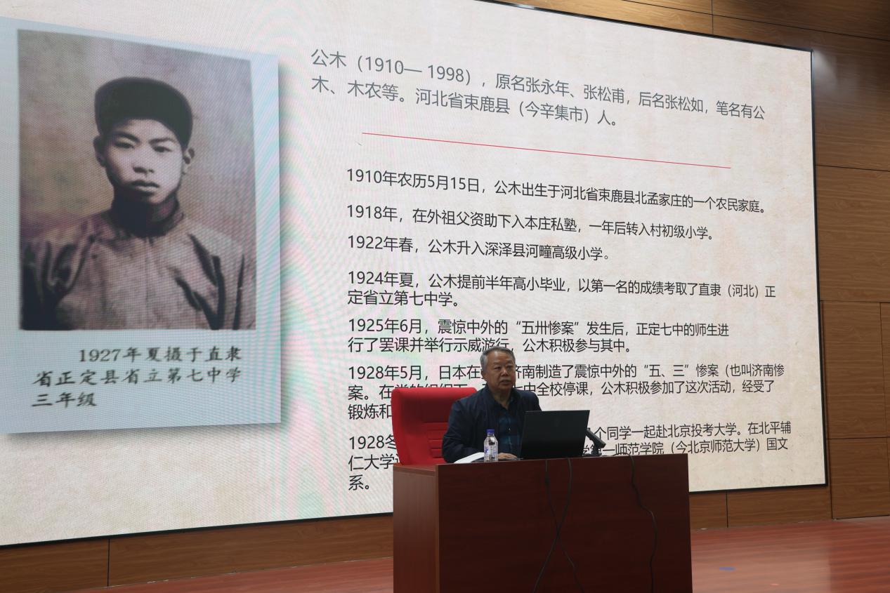 名誉院长等职务。在报告中,王老师生动地讲解了公木先生作为一名中共党员的奋斗历程。在王老师讲述过程中,公木先生的一生是追逐理想、坚守信仰、追求真理的一生,是青少年时代就投身革命洪流、为祖国繁荣富强和民族解放事业奋斗的一生,是“以诗歌为生命”为人民勤奋创作奉献文艺精品的一生,是以极大热情投入教学科研、“甘化泥土润花根”为国家建设事业培养大批栋梁人才的一生。公木先生少年时代就开始接受革命启蒙教育,中学阶段积极参加反帝爱国运动。成年后,为奔赴抗日前线,将未满两岁小女儿寄养在老乡家。1945年9月在毛主席“建立巩固的东北根据地”的战略部署下,公木在延安参加“东北文艺工作团”被派到东北工作。王老师还向同学们介绍了公木先生文学艺术上的造诣和成就,以及作为一名老党员的坚定信念与无私奉献的精神,详细解读了公木先生对党忠诚的坚定理想信念,充分强调了公木先生“北上精神”和面对人生逆境时表现出来的对党无限忠诚的革命意志。