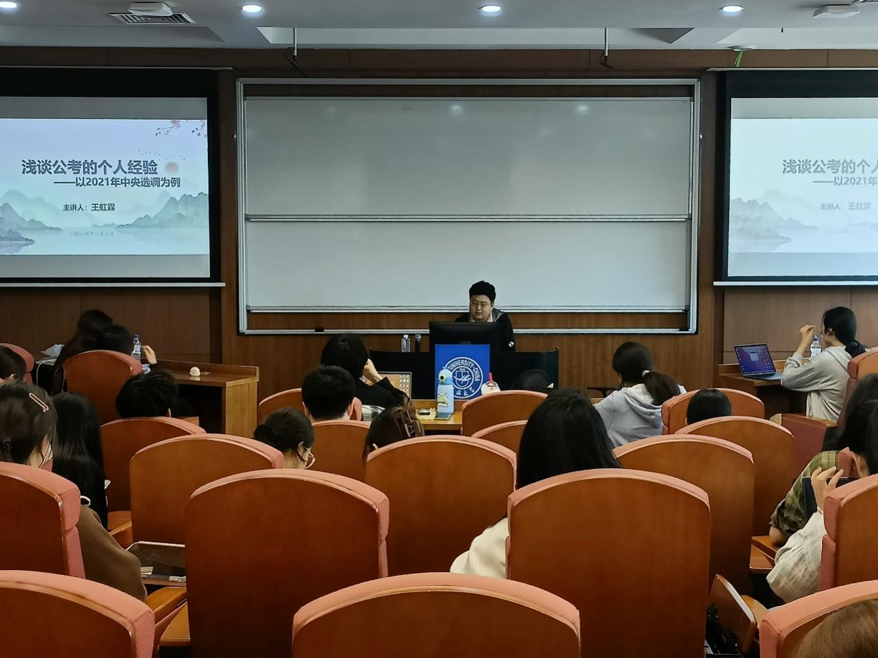 于2024年6月2日下午两点三十分在逸夫楼第六阶梯教室成功举办了2025公考经验分享会,此次会议邀请了优秀校友王虹霖作为主讲嘉宾,为成人在线