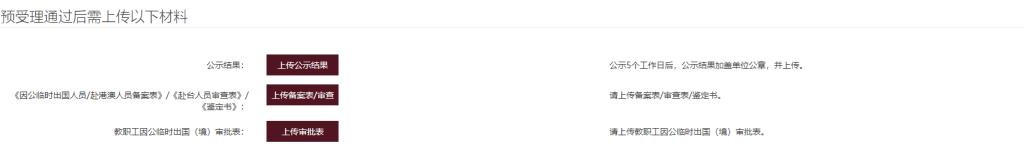 7. 领取出国/赴港澳的任务批件(通知书)或赴台请示。领取出国/赴港澳的任务批件(通知书)或赴台请示时,须提交已上传附件的纸质版。