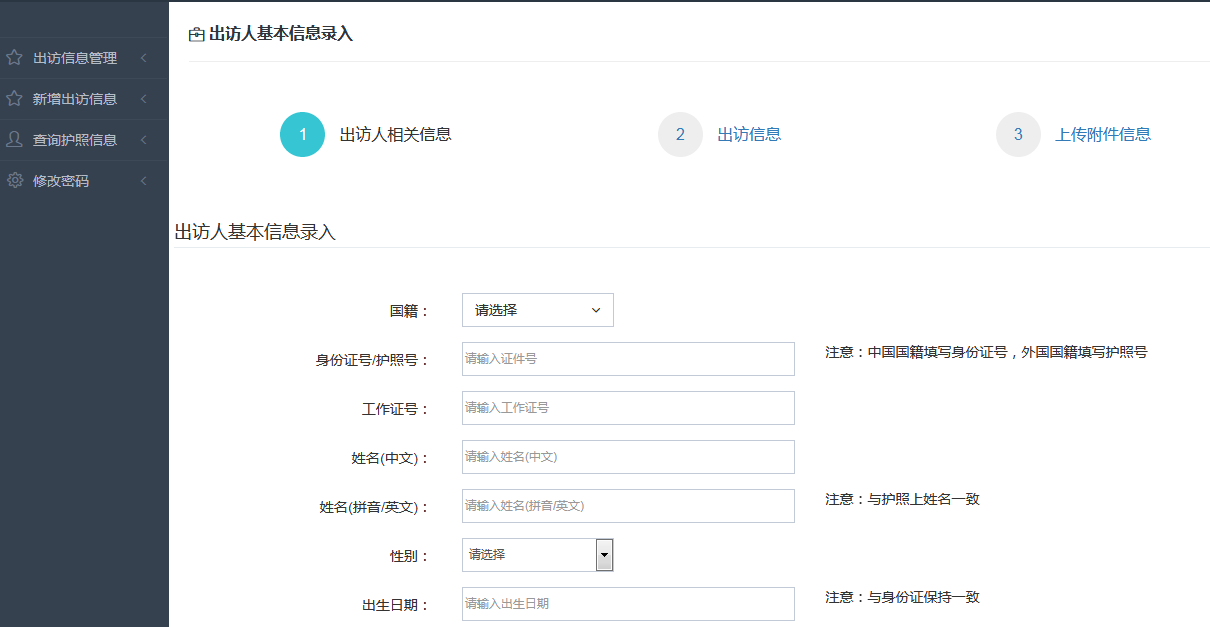 3. 登录成功后,在“新增出访信息”栏目下填写出访人相关信息、出访信息、上传附件信息并提交。