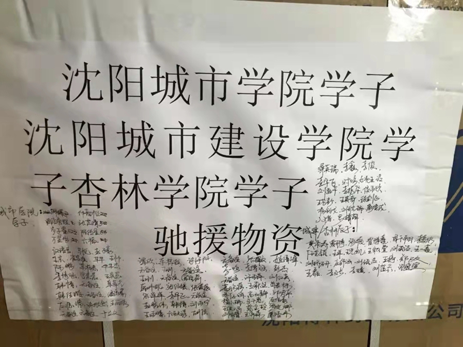 3月23日,同样封闭在校园内的沈阳城市学院、城市建设学院、杏林学院100余名学子,用自己的零用钱购买了1万个医用外科口罩,并在每一个口罩箱子上都写满爱心签名和祝福,通过当地应急救援团队连夜送到成人在线