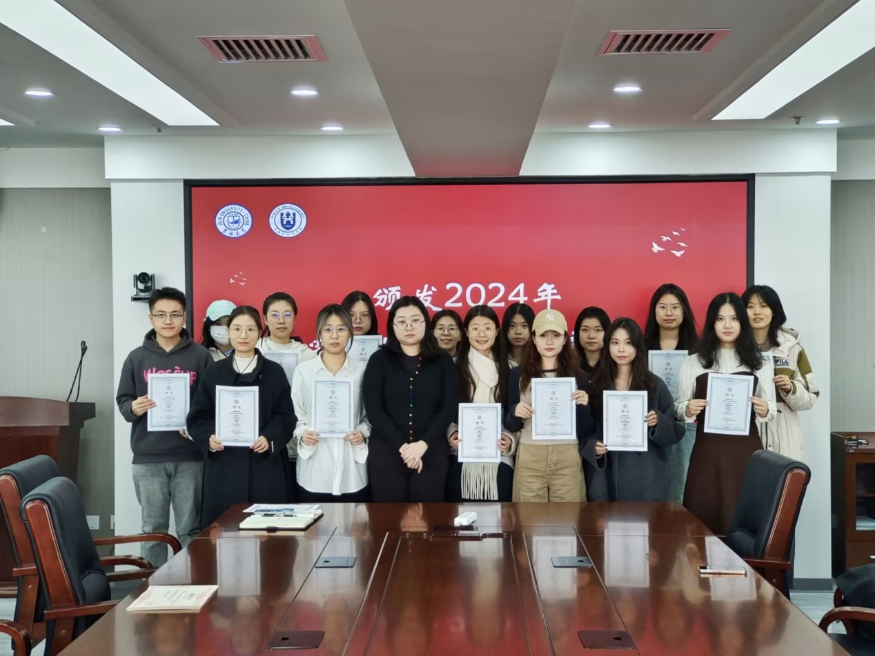大会第二项,对2024年院优秀研究生干部进行表彰。主持人宣读2024年院优秀研究生干部名单,孙童老师为以上同学颁发证书并合影留念。