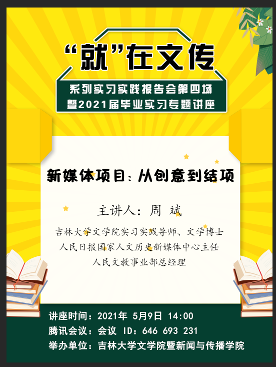 讲座时间:2021年 5月9日 14:00腾讯会议:会议 ID:646 693 231 举办单位:成人在线 暨新闻与传播学院