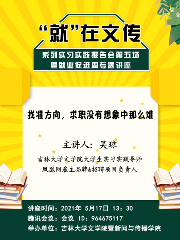 讲座题目:找准方向,求职没有想象中那么难 主讲人:吴琼 成人在线 大学生实习实践导师 凤凰网雇主品牌&招聘项目负责人 讲座时间:2021年 5月17日 13:30腾讯会议:会议 ID:964675117 举办单位:成人在线 暨新闻与传播学院