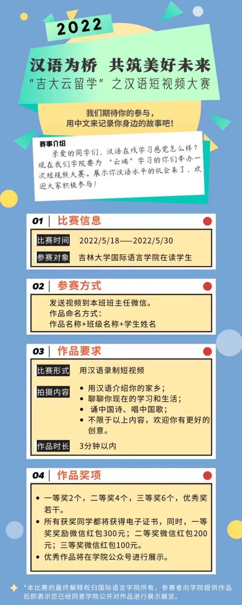 亲爱的同学们,汉语在线学习感觉怎么样? 现在我们学院要为“云端”学习的你们举办一次短视频大赛。展示你汉语水平的机会来了,欢迎大家积极参与!